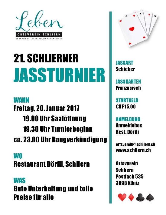 « Alle Veranstaltungen Diese Veranstaltung hat bereits stattgefunden. Jassturnier 20. Januar 2017 33. Schlierner Fasnacht » Das traditionelle Jassturnier findet am Freitag, 20. Januar 2017 im Restaurant Dörfli statt. Zum Kalender hinzufügen Google Kalender iCalendar Outlook 365 Outlook Live Details Datum: 20. Januar 2017 Veranstaltung-Tags:Ortsverein Veranstaltungsort Restaurant Dörfli Dörfliweg 8 Schliern, Schweiz Google Karte anzeigen Veranstalter Ortsverein Schliern